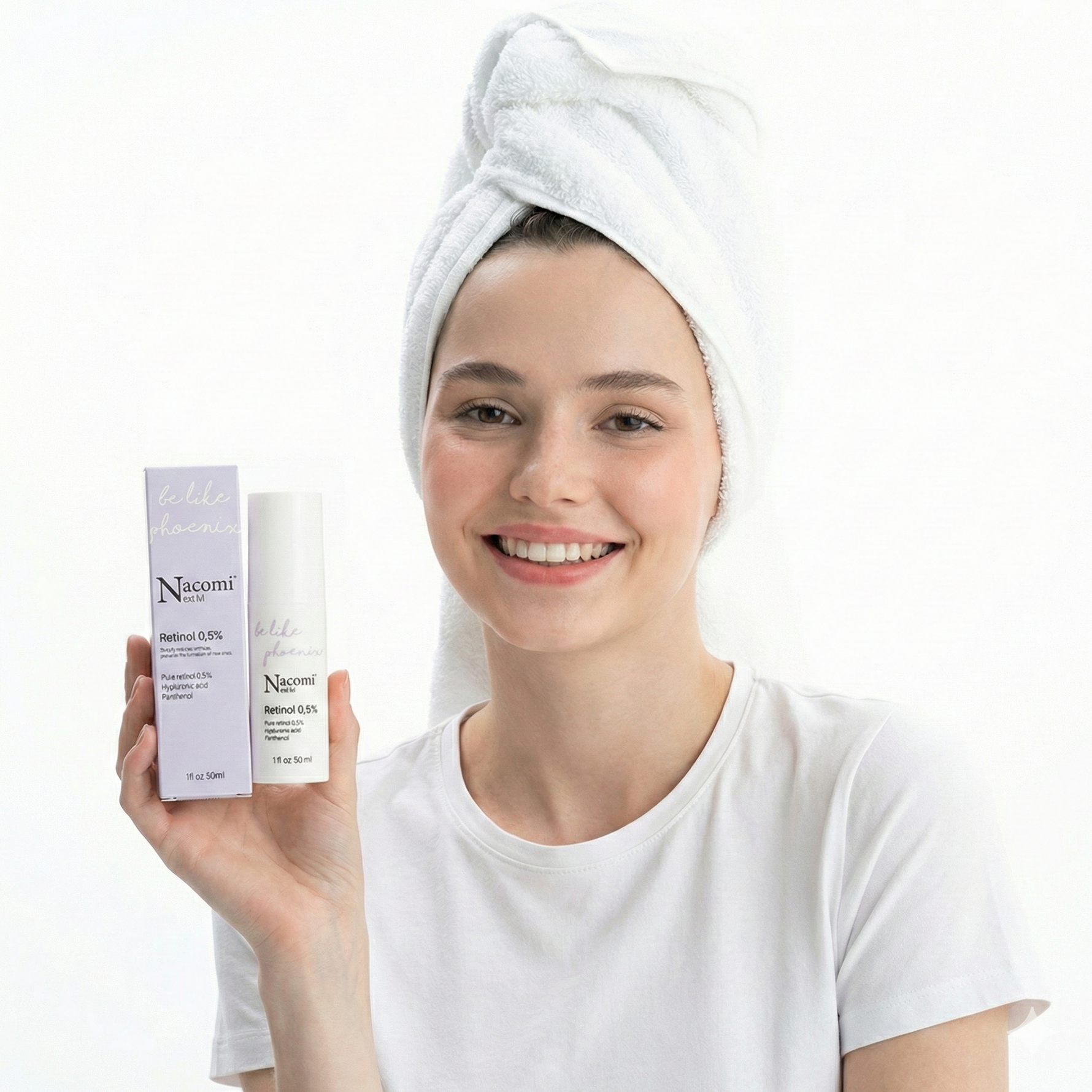 Serum with 0.5% Retinol, Panthenol, and Hyaluronic Acid, designed to improve skin texture, reduce fine lines, and support skin regeneration. Suitable for most skin types.