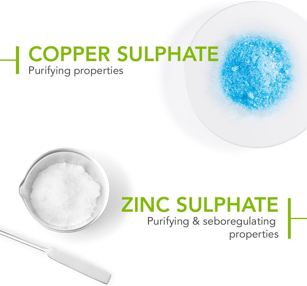 • كبريتات النحاس: يقدم فوائد مضادة للبكتيريا ويساعد على شفاء البشرة.